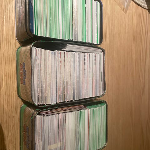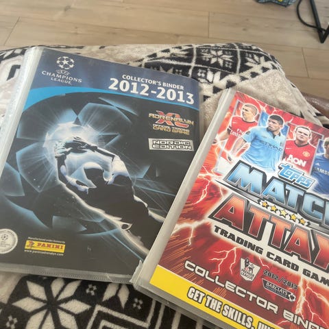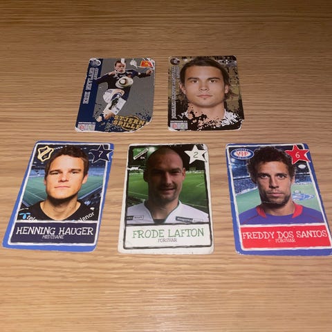Flere 100 fotballkort selges. Ligger i mapper. Det er tilsammen 7 mapper. Alle er ikke like fulle, men det er flere 100 kort. Selges samlet. Fin tilstand på de siden de ligger beskyttet.