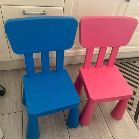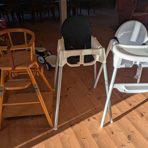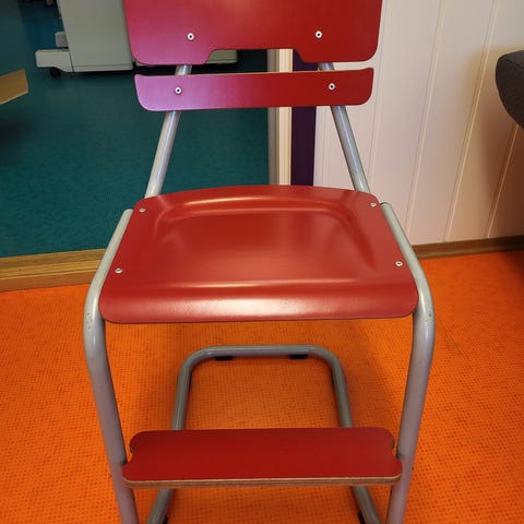 Hele og pene stoler med noen få merker men med masse bruk igjen. To forskjellige høyder som vist på bilde, der man får en annen høyde av å snu stolen. Den kan også brukes som krakk.
