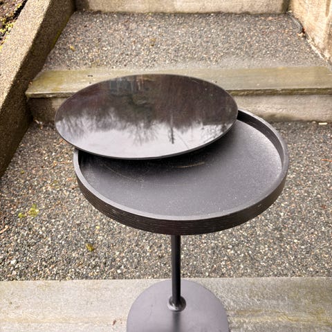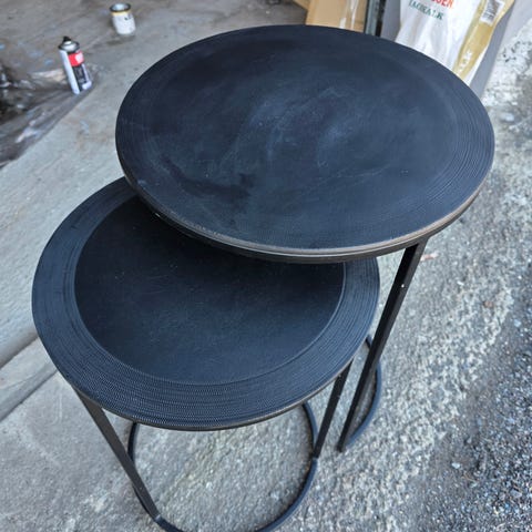 To små bord i støpejern og tre. Den ene har en liten skade, så er så vidt litt vipp i bordplaten. Farge svart.