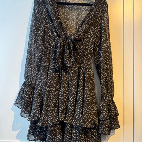 Nelly festkjole i størrelse XL, fargen gull. Laget av paljetter som gir et glitrende utseende. Kjolen har lange ermer og en v-formet utringning.