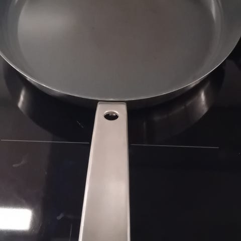 Stekepanne på 28 cm i diameter selges. Den er laget av rustfritt stål med slipp belegg. Tåler stekeovn. Den er lite brukt. Selges for 150 kroner eller bud.