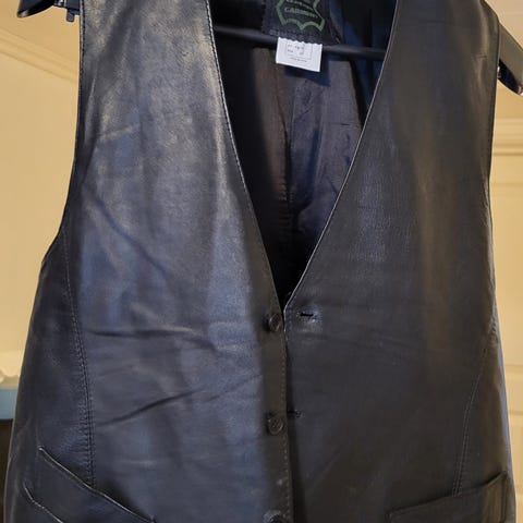 Beskrivelse: Solid skinnvest med klassisk design, laget av merkevaren Leather Man. Perfekt for deg som liker tidløst, røft uttrykk. Vesten er godt vedlikeholdt og fremstår som ryddig og klar for ny eier.
