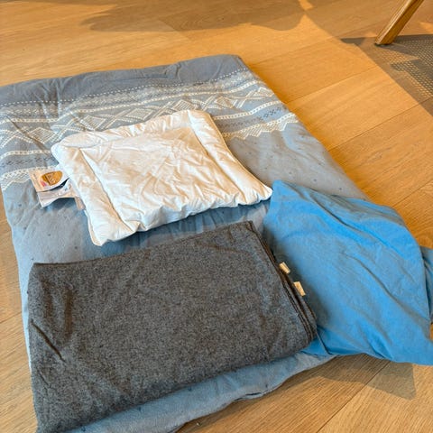 Nordun barnedundyne med trekk. Dynen og trekket er i nøytrale farger med et mønster på trekket som viser bjørner og trær. Dynen er kviltet med ruter og laget for barn. Kjøpt nytt til barnebarn.