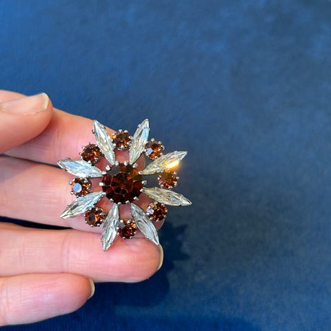 Vakker vintage brosje metall blått glass filigran umerket 5*3,5 cm. Selges 350kr + evt frakt 69kr postnord eller fiks ferdig