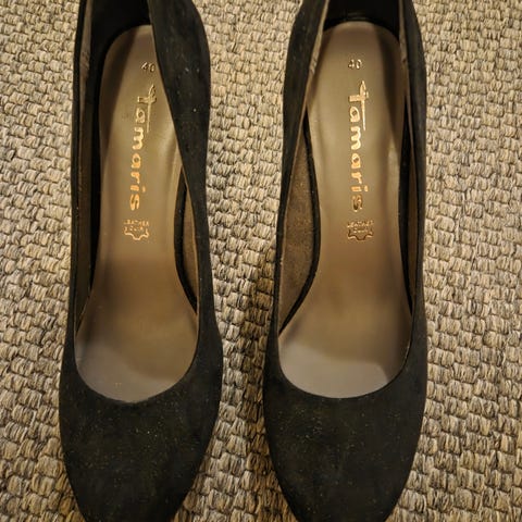 Tamaris hæler i størrelse 40. Skoene er svarte med en kombinasjon av matt og blankt materiale. Designet med lukking på siden og en middels høy hæl.