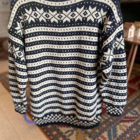 Hjemmestrikket ull genser i hvit farge med beige og brunt mønster! Størrelse S-M. Lite brukt og i fin stand.