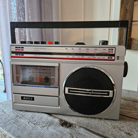 Det medfølger original ledningen. Ser ut som det og kan brukes batterier. Antenna har knekt litt øverst. I front høytaler i hver ende. 8 stk kassetter av varierende slag medfølger.