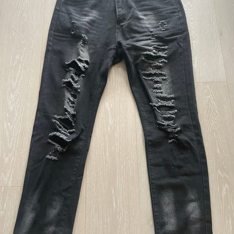 Har en mørkegrå bukse som blir bare liggende. Ingen hull