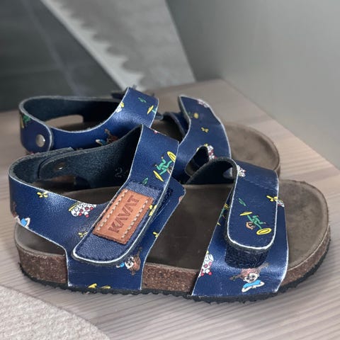 Birkenstock barnesandal i størrelse 35 for gutt. Sandalen har blått mønster med hvite detaljer og justerbare stropper. Laget med komfortabel såle og slitesterkt materiale.