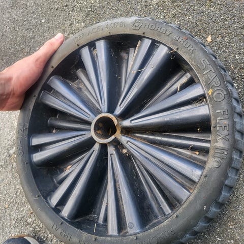 Selger et reservehjul med jekk og hjulvinne, inkludert isoporen som holder sistnevnte på plass. Hjulet ser ubrukt ut.