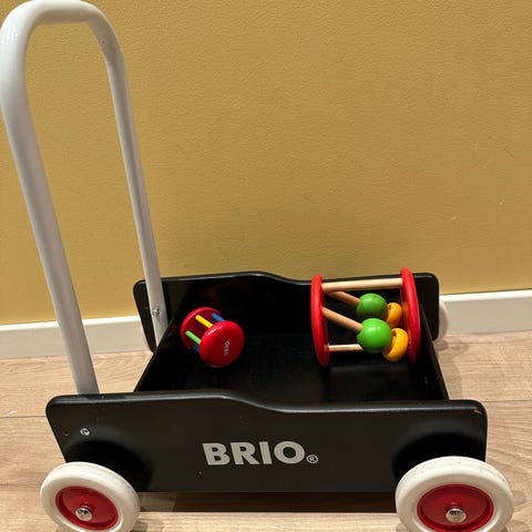 BRIO Barnetralle i hvit og grønn farge. Laget av holdbart materiale, designet for barn til å skyve og leke med.