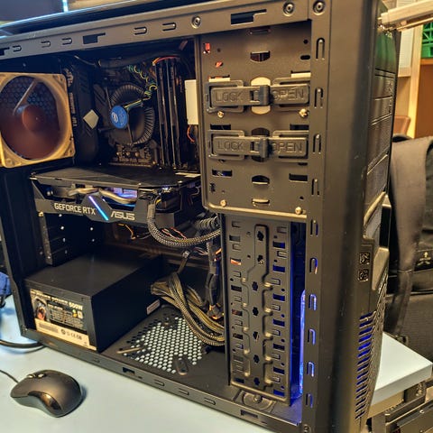Velfungerende stasjonær pc med stort Corsair tower (H: 50 cm./B: 22 cm./D: 53 cm.).