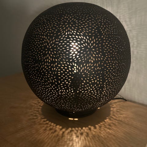 Dekorlampe i perforert metall selges. Lampen gir et stemningsfullt og varmt lysspill gjennom mønstrene i metallet, og fungerer både som belysning og som et dekorativt blikkfang i rommet. Kugleformet design, detaljert utskjæring og vakker lyseffekt på vegg og flater rundt.
