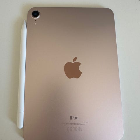 Apple iPad Mini 6 med 256 GB lagringskapasitet. Nettbrett med kompakt design, egnet for daglig bruk og mobilitet. Følger med eske, 2 deksler (apple sitt originaldeksel i oransje, og deksel fra Eplehuset - Pomologic book cover), og Doodroo skjermbeskytter som imiterer papir. Har en ekstra skjermbeskytter som også følger med.