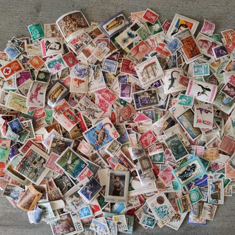 50 gram (ca 500-550 stk) frimerker fra Ungarn. Mange forskjellige, men også en del dubletter. Verdi ukjent, men har observert et stemplet merke fra 2006 pålydende 1000 forinter. Dette har en verdi på 10 Euro ifølge katalogen på Stampworld.com.