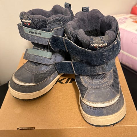 Viking barnesko i størrelse 24. Skoene er av goretex og beskytter dermed litt mot sølepytter. De er relativt slitt foran på tuppene, men fullt brukbare. Det er ikke hull igjennom, men ytre del av skinnet som dekker er slitt ned slik at det blir farheforskjell.