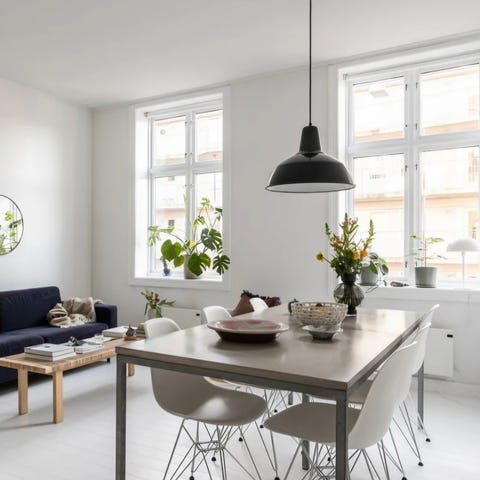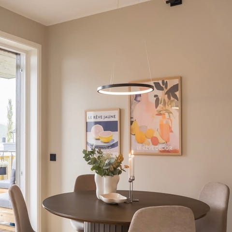 Takpendel med integrert LED. Dimmbar ned mot en varmere lysfarge. Kabelen til lampen er elegant med hvit tekstil.