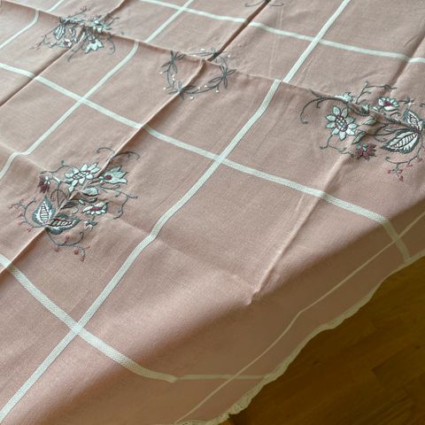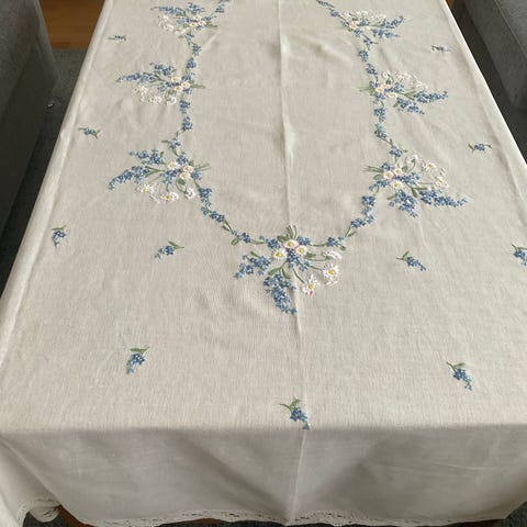 Brodert duk med blomstermotiv i flere farger på hvit bakgrunn. Duken er 107 x 107 cm med broderte blomster og blader som danner et dekorativt sirkelformet mønster. Duken er i lin, og egner seg til fint som borddekorasjon. Nydelig og sommerlig 🥰