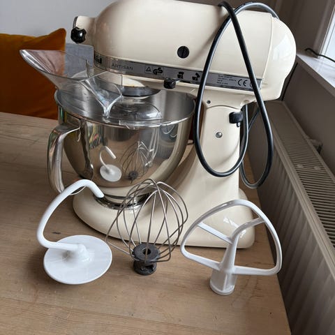Kitchenaid maskin med bolle, 3 visper og kjøttkvernutstyr selges helst samlet. Funker ikke på 1. gir, trenger sikkert service. Avskalling på krok.