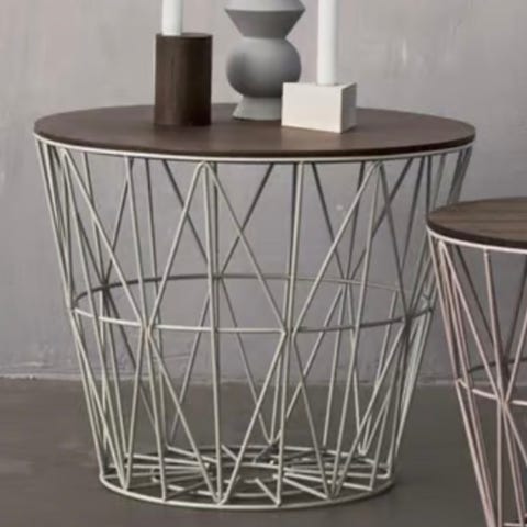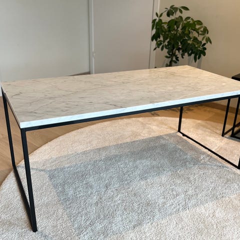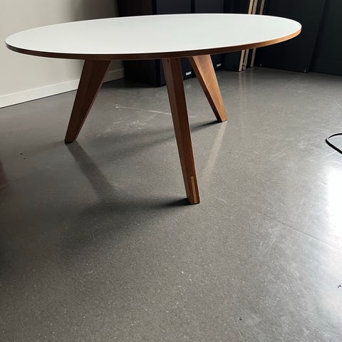 Stilig bord fra Bolia med hvitlakkert understell i stål og treplate. Diameter 86 cm og høyde 38 cm. Bør hentes