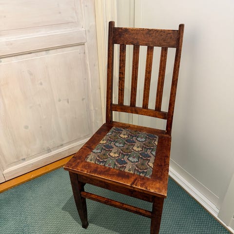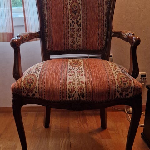 Fire eldre stoler av fransk opprinnelse med relativ ny stopping og gjordebånd. Trukket om for ca 15 år siden, men stoffet er noen steder litt falmet og har noen flekker. Hver stol har hjul på fremre bein, som originalt. Ellers bra stand. Selges samlet.