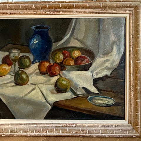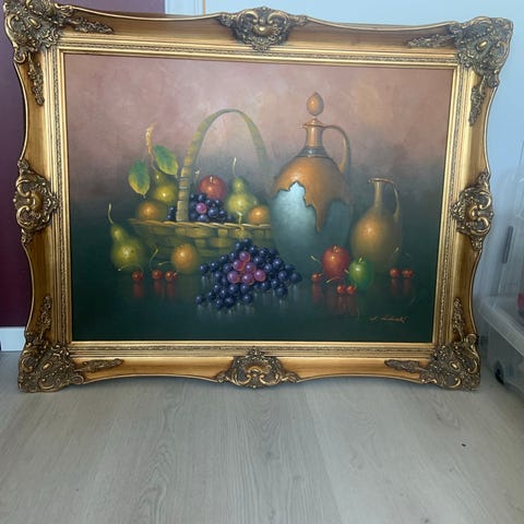 Signert olje på lerret stilleben maleri som viser en komposisjon av frukt, glass og dekorative elementer. Maleriet er innrammet i en dekorativ ramme med detaljer. Signert Peter Kloton.