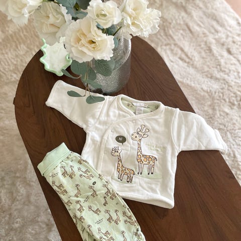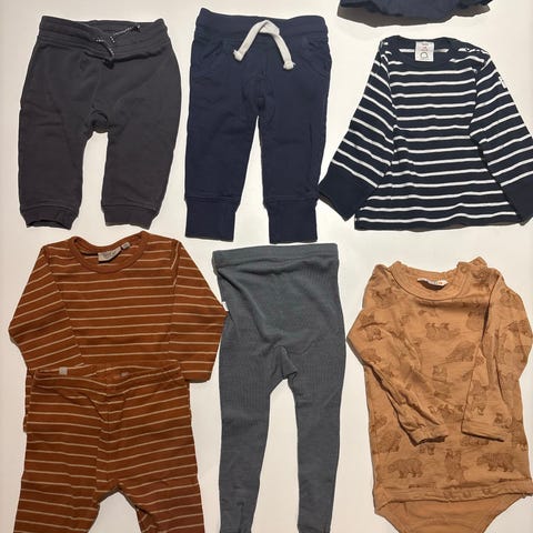 Et barneklær sett i størrelse 62, farge grå, unisex. Settet inkluderer flere plagg med ulike mønstre og design, egnet for barn i denne størrelsen.