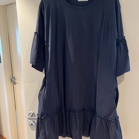 Arnie Says Hverdagskjole i oransje farge, størrelse XL. Kjolen har et mønstret design med kort erme og volangdetaljer.