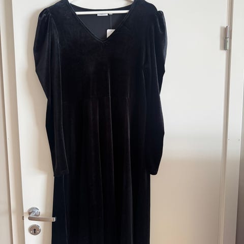 Max Mara Festkjole i størrelse S, laget av svart fløyel. Kjolen har lange ermer og V-hals med kontrasterende kantdetaljer.