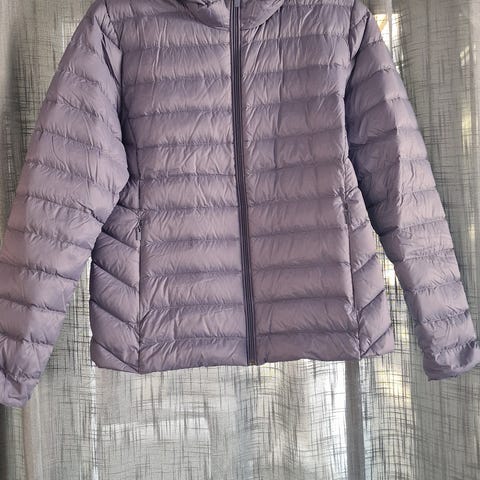 Klassisk lett dunjakke med hette. Jakken har krage, glidelås hele veien foran i front og to glidelåslommer i siden. Normal passform.