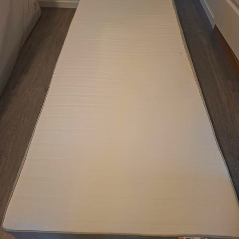 Pent brukt IKEA Vyssa voksemadrass som har blitt brukt til en vokseseng (IKEA Busunge). Største delen er 80x160 med to medfølgende deler på 80x40 hver så madrassen kan brukes som 80x120, 80x160 eller 80x200.