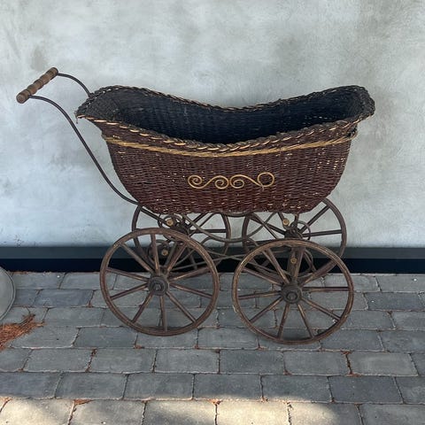 Vintage dukkevogn med hvit tekstil og rottingkurv