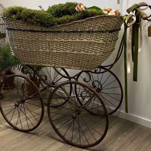 Vintage dukkevogn med rottingkurv og hvit tekstiltrekk. Vognen har store hjul og metallramme, med dekorative detaljer i tekstilet. Passer til bruk som dukkevogn eller som dekorativt element.