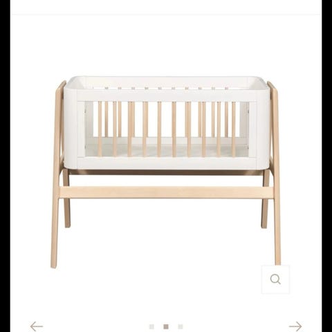 Laget av tre med spiler på sidene. Designet for å gi en trygg og komfortabel soveplass for spedbarn.