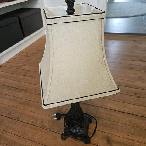 Eldre bordlampe selges. Ca 37 cm høy. Foten ser ut som et fruktfat. Noe slitasje øverst på skjermen.