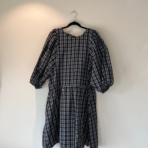 Svart kjole for dame i størrelse M med mønster. Langermet design med elastisk midje og knappelukking foran. Laget i lett materiale egnet for hverdagsbruk eller fest 🥳