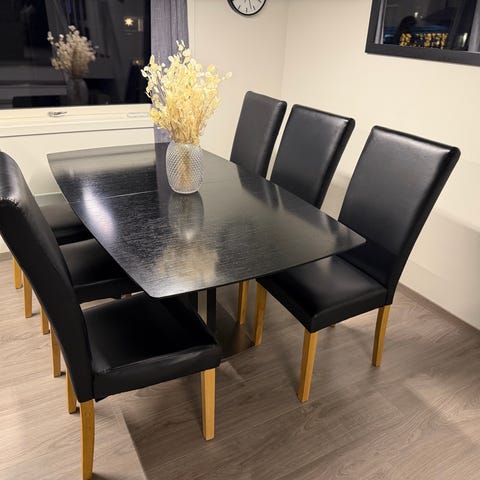 Spisebord i sort kjøpt fra A-Møbler i 2012 (verdi 15 000kr) selges grunnet flytting. Bordet er forlengbar, stor og fungerer perfekt for store selskap i hjemmet.
