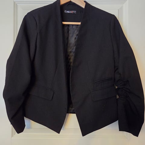 Mørkeblå dressjakke , 2 lommer foran 2 splitter bak .