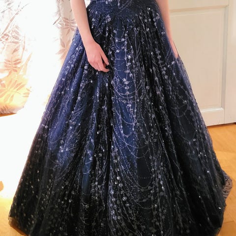 Ubrukt perle av en designer kjole fra Naeem Khan. Kjolen er fra kolleksjon fra 2018, første bilde viser kjolen på runway’en. Har veldig vanskelig for å gi slipp på denne for den er helt nydelig men den passer meg dessverre ikke og den fortjener å bli brukt. Størrelsen er en amerikansk str 12, noe jeg vil si er en str L/XL.