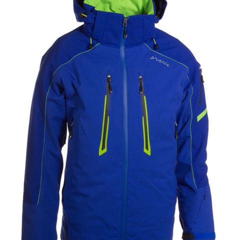 Jakken har blå og hvit fargekombinasjon og har hette og detaljer i kontrastfarger.