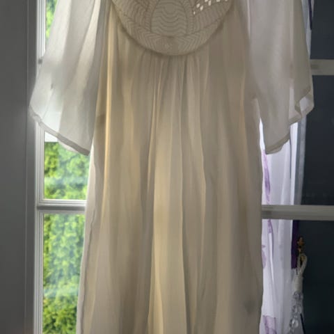 DAY Birger et Mikkelsen kjole i størrelse 40. Kjolen er beige og laget av silke. Den har dekorative detaljer med paljetter. Underkjole med delikat mønster