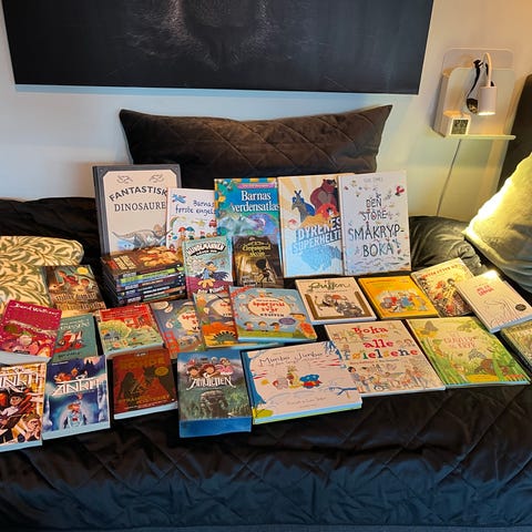 Stor pakke med diverse barnebøker, passer fra 2 år og oppover. Her finner du både Brillebjørn, Karsten og Petra, Ludde, Thomastoget, dinosaurer og maskiner. Noen godt brukt, mens noen er nesten ikke synlig brukt i det hele tatt. To av bøkene med lyd må få nye batterier.