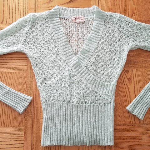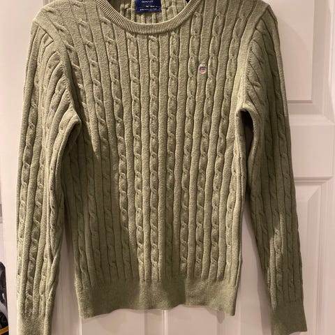 LT genser i størrelse M for kvinner. Genseren er grønn og laget av bomull. Den har strukturstrikkede detaljer og rund hals.