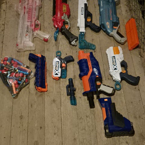 leketøysgevær med hvit, oransje og grønn farge. Designet for barn og unge, laget i plastmateriale. Leveres med flere skumprosjektiler, egnet for innendørs og utendørs lek.