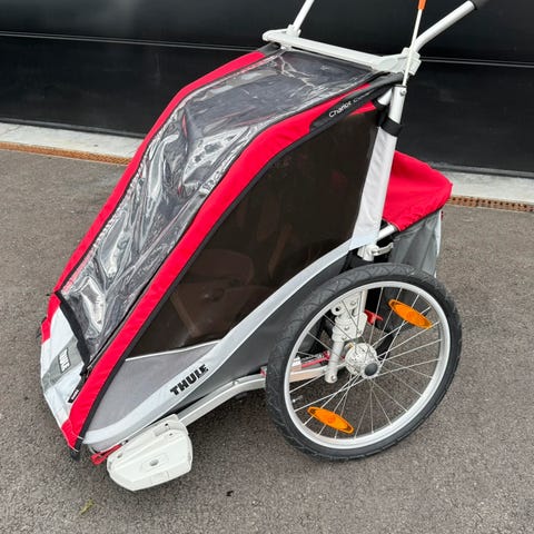5 år gammel og pent brukt. Delt seterygg, feste til sykkelvogn og sitteunderlag som vist på bilde medfølger.