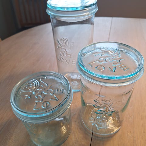 Ca 20 cm høye Løveglass. Ca 1,5 liter. Gamle glass. Se bilder, noen skår. Selges samlet.