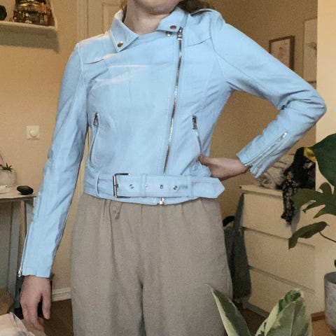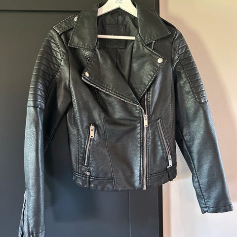 Cubus skinnjakke i størrelse 36 (liten S) for kvinner. Jakken er svart og laget av ekte skinn med polyesterfôr. Den har glidelåslommer og belte i livet.