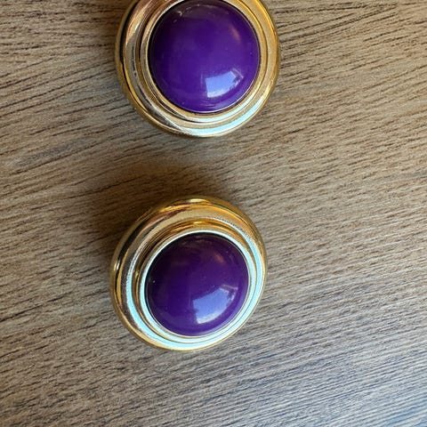 Ørepynt med rund form, rød midtdel og gullfarget ramme. Herlig vintage.