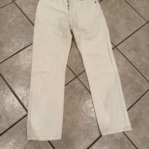 Levi's 501 jeans i beige farge, str. 32/34. Kjøpt i Los Angeles i 1995, nesten ikke brukt. Ligget godt oppbevart innerst i et skap i mange år. God kvalitet, stoffet er solid og produsert i UK.