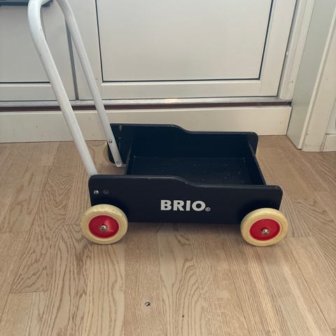 BRIO barnevogn for barn i svart farge med hvite håndtak og røde hjul.